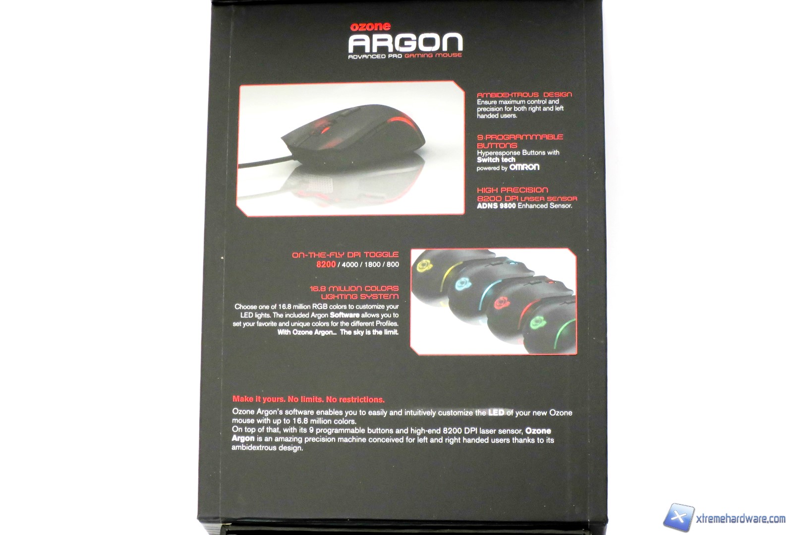 Come abbiamo detto non ci sono grosse novità o differenze rispetto alla versione Argon Ocelote World anche perché il prodotto è il medesimo, commercializzato e presentato in due versioni distinte. Abbiamo infatti la serie Ocelote World che è stata ispirata al campione Carlos "Ocelote" Rodríguez Santiago e la serie base in colorazione nera. Anche sul sito di Ozone possiamo vedere come la versione classica dei prodotti abbia una colorazione nera mentre la serie in edizione “limitata” Ocelote riprende lo schema di colori nero/arancione. Non dilungandoci troppo e tornando al prodotto in test, abbiamo come sempre un mouse ambidestro con dimensioni di 124.6 x 66.9 x 40 mm per un peso complessivo, senza pesi aggiuntivi, di 125 grammi. La presa standard è una finger tip ma con una presa claw grip forse andremo ad impugnarlo ancora meglio. Dunque possiamo notare la colorazione full black oltre alla classica superficie Soft-Touch presente nella parte superiore del mouse e quella gommata ai lati. Dunque partendo l’analisi dall’alto troviamo come sempre la superficie Soft-Touch ed i classici tasti che erano presenti anche sull’altro modello. Nel dorso il classico logo Ozone che si illuminerà del colore scelto nel software di gestione. A seguire nel dettaglio troviamo i due tasti per lo switch dei DPI On-The-Fly con una piccola striscia di colore bianco/argento al centro. Spostandoci vero la parte anteriore troviamo il classico Scroll di tipo cliccabile e con superficie gommata e piccole scanalature per migliorare il grip e per “sapere” sempre che stiamo cambiando “opzione” o “arma” in gioco. Non mancano i due classici tasti per il click destro e sinistro. Questa volta non abbiamo la serigrafia “Ocelote World” a lato del tasto sinistro.