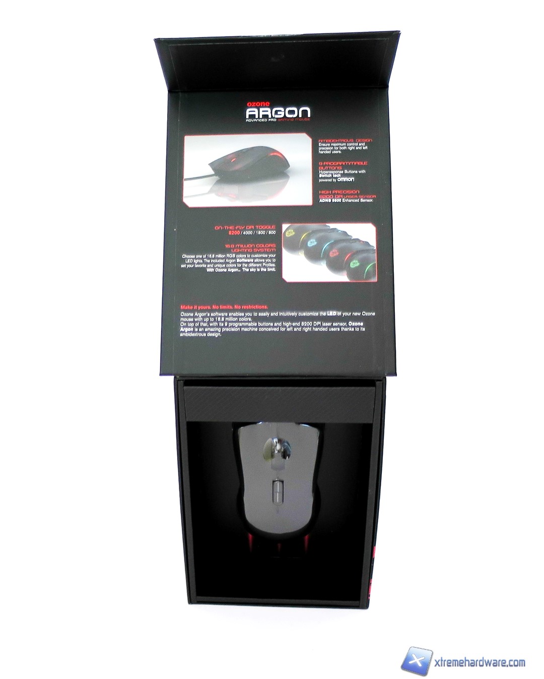 Dopo aver rimosso il sigillo, abbiamo un’apertura verso l’alto della confezione. E’ presente non solo una protezione in plastica che ci permetterà di scrutare il mouse all’interno ma anche ed ulteriore descrizione del prodotto e delle sue funzionalità RGB.