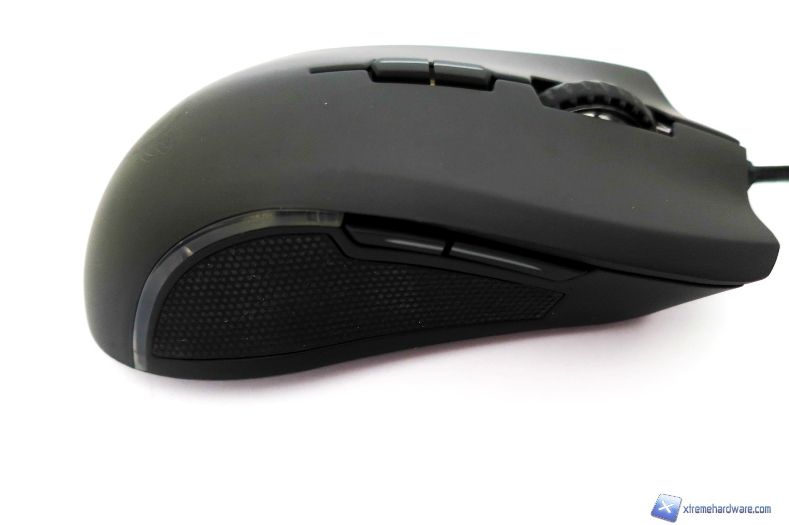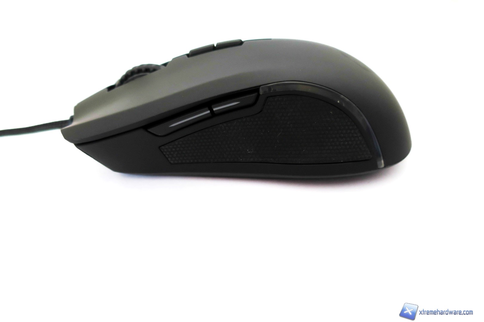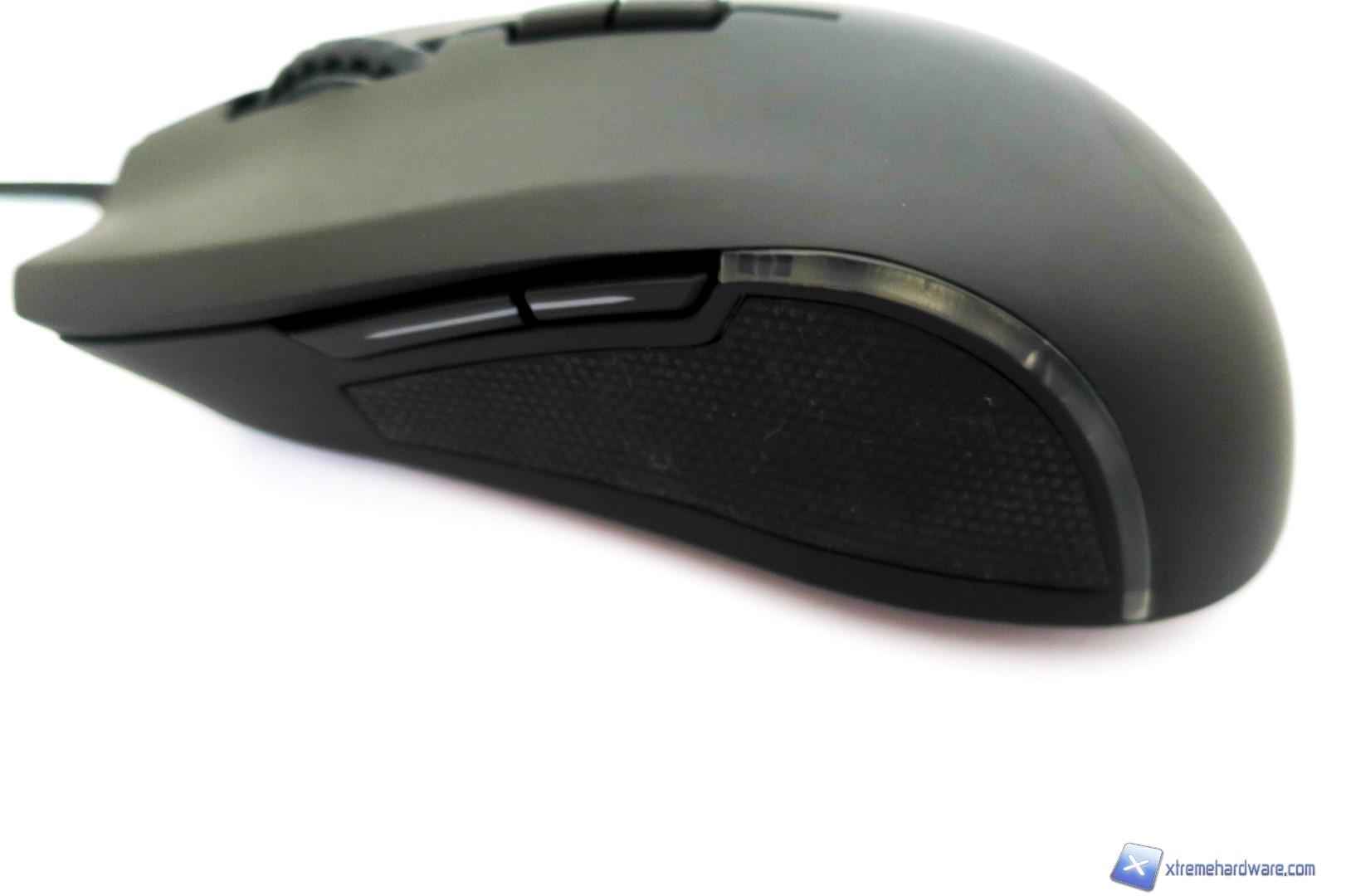 Passando al lato sinistro qui troviamo la classica superficie gommata che permette una migliore presa ed impugnatura laterale del mouse oltre a i due classici tasti avanti/dietro facilmente assegnabili con altre funzioni sempre tramite il software di gestione. Non manca una piccola striscia in plastica che diffonderà il colore scelto per il set di LED posti sotto la scocca del mouse.