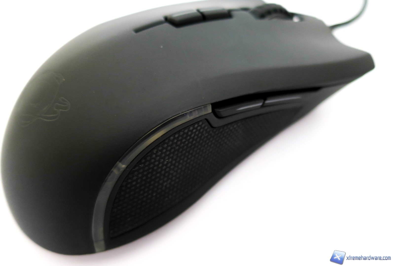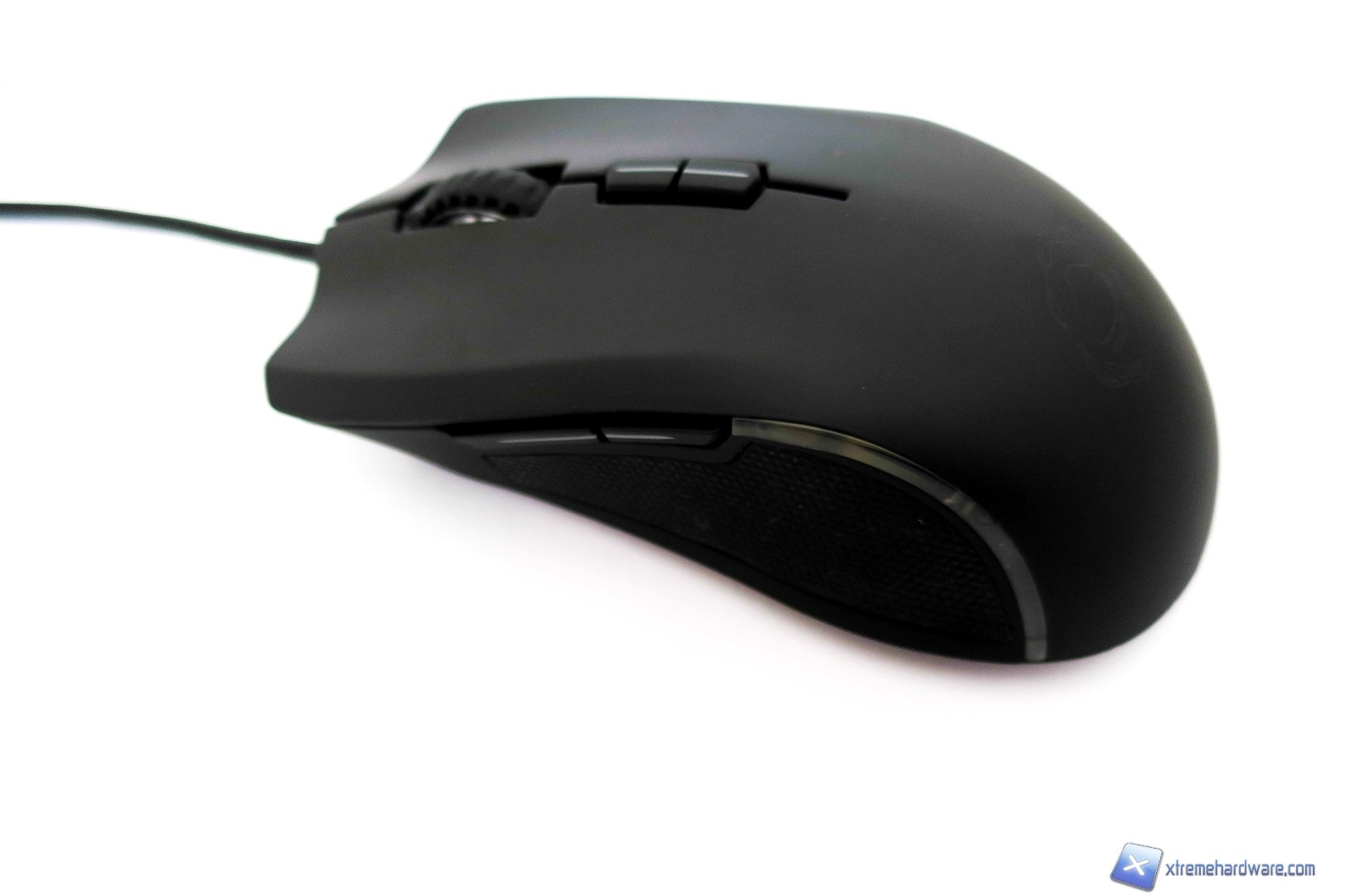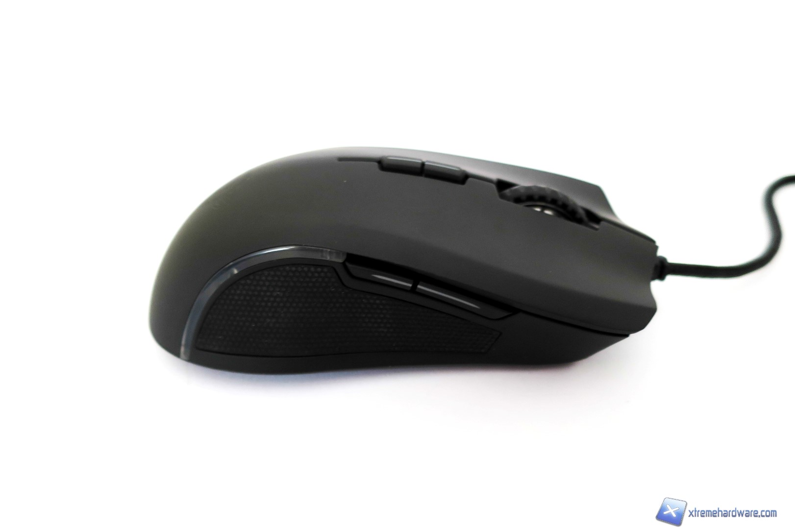 Passando al lato sinistro qui troviamo la classica superficie gommata che permette una migliore presa ed impugnatura laterale del mouse oltre a i due classici tasti avanti/dietro facilmente assegnabili con altre funzioni sempre tramite il software di gestione. Non manca una piccola striscia in plastica che diffonderà il colore scelto per il set di LED posti sotto la scocca del mouse.