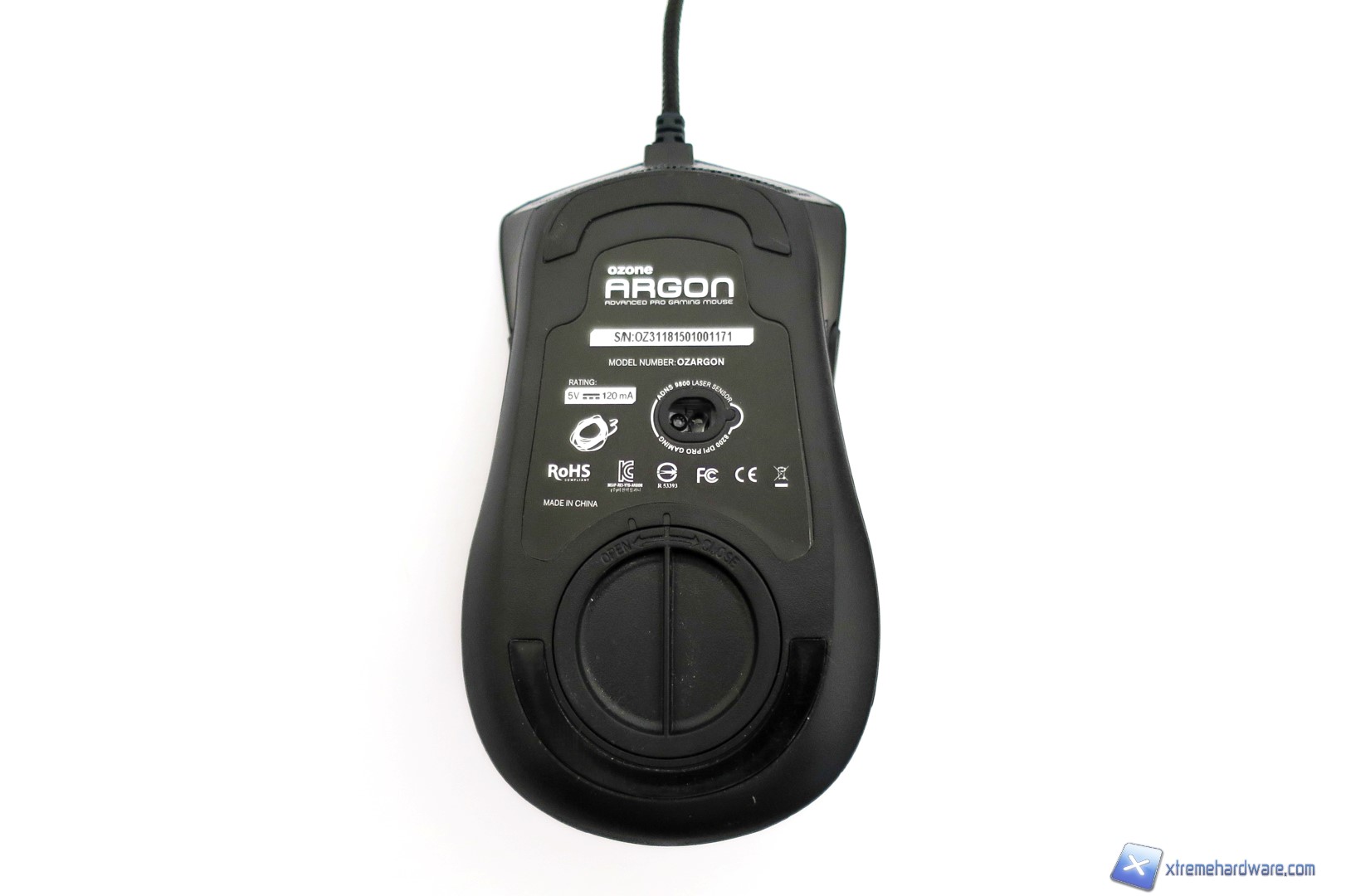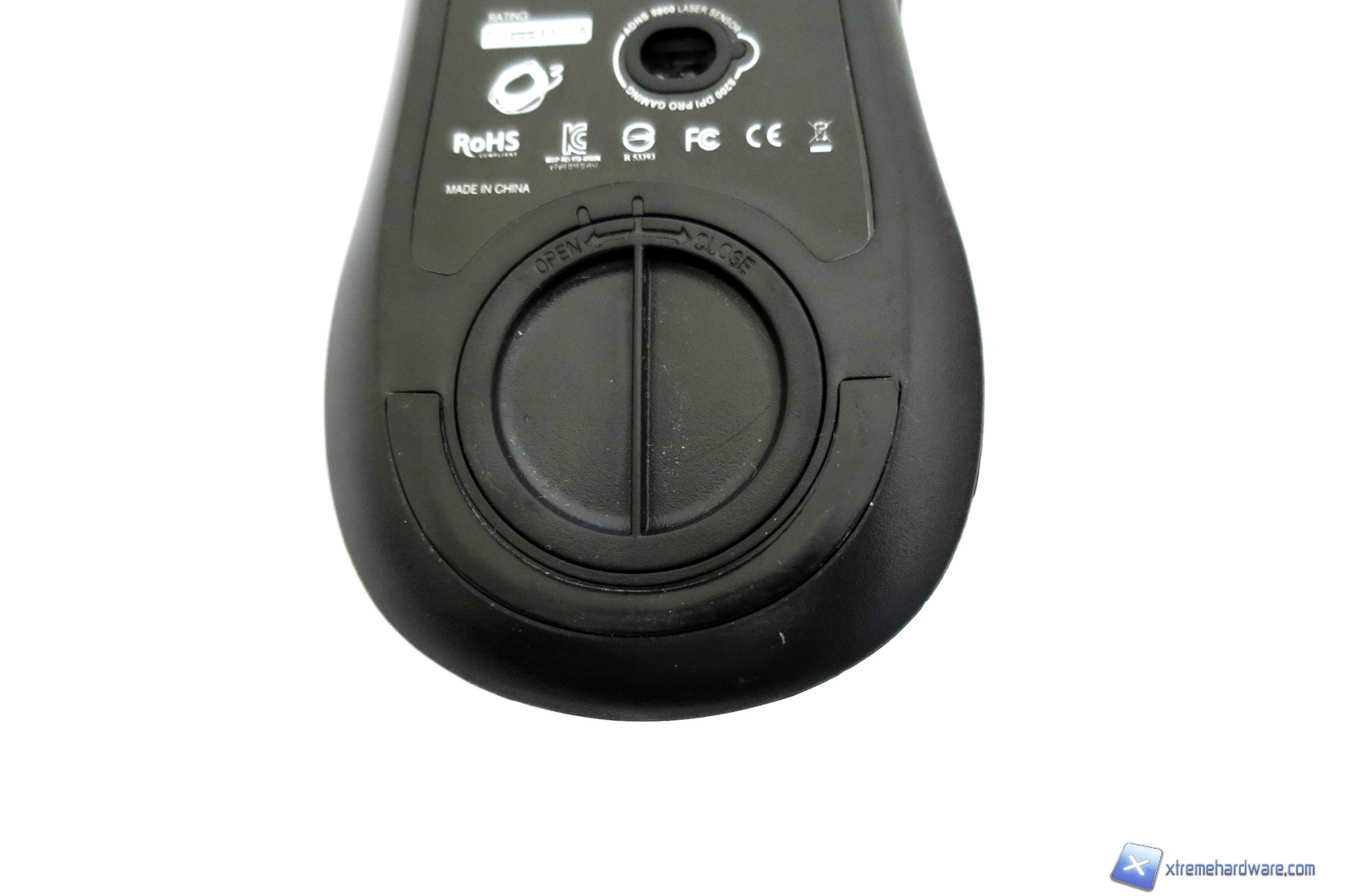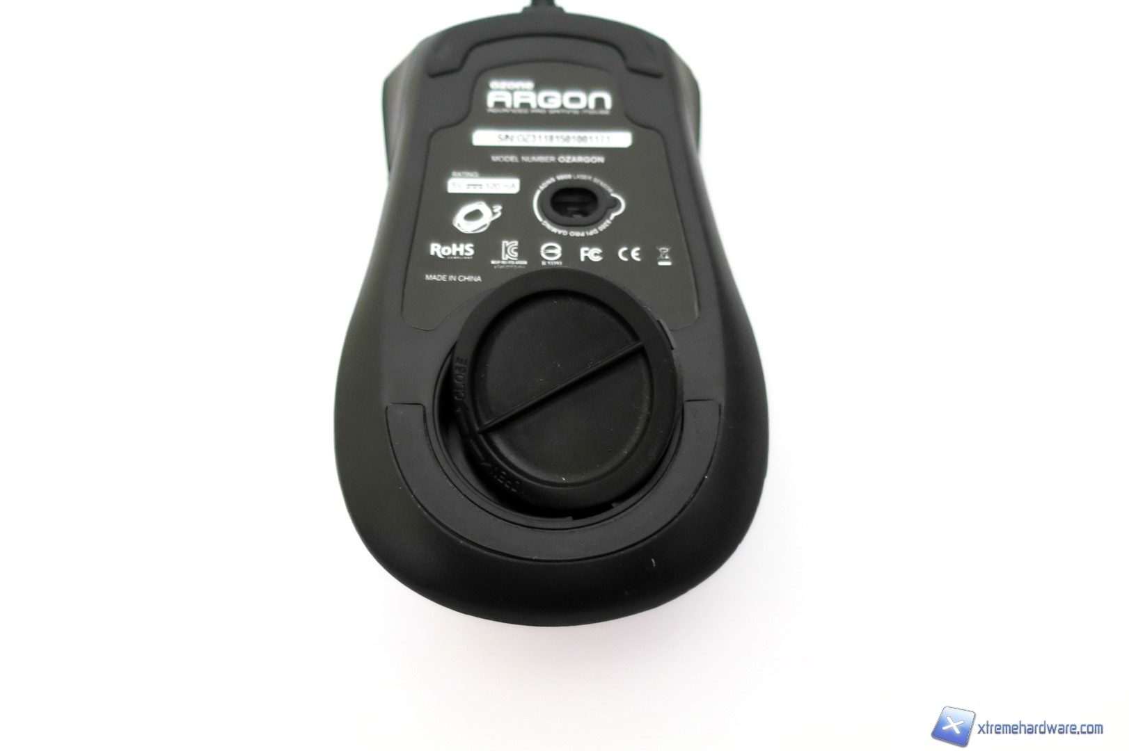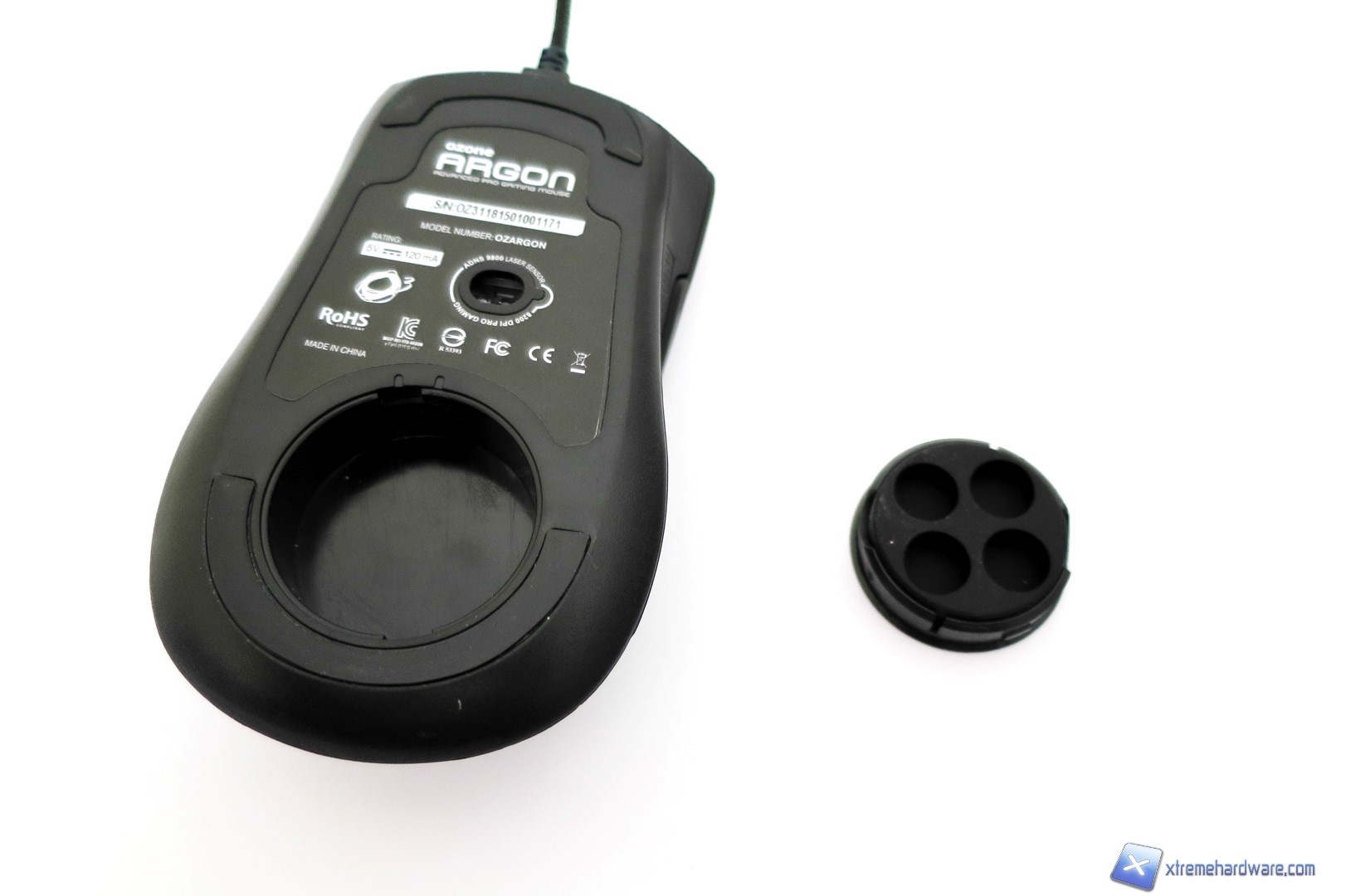 Capovolgendo il mouse, passiamo a dare uno sguardo a cosa si cela sotto. Come sempre al centro, ma in posizione spostata rispetto al baricentro del mouse, è presente il sensore laser AVAGO ADNS-9800 contornato da un adesivo con varie informazioni. Nella parte superiore ed inferiore troviamo i due mousefeet mentre poco sotto il sensore troviamo il vano che ci permetterà di customizzare il peso totale del mouse. Aperto il vano con un piccolo gesto, potremo inserirvi i pesetti inclusi nella confezione o lasciare tutto invariato. Nel bundle, come per il modello Ocelote, troviamo un set di pesetti in alluminio. Nel dettaglio sono forniti 4 pesetti da 4,5 grammi ciascuno per un totale di 18 grammi da sommare tutti o in parte al peso già di per se buono del mouse.