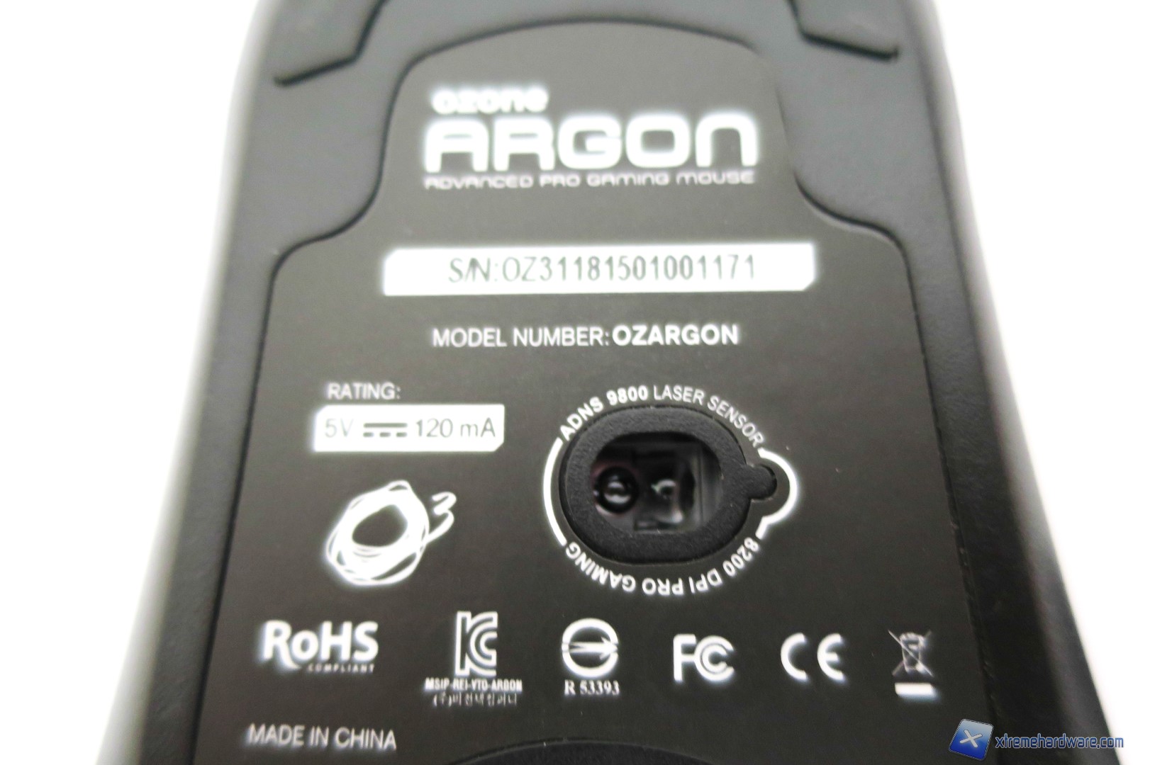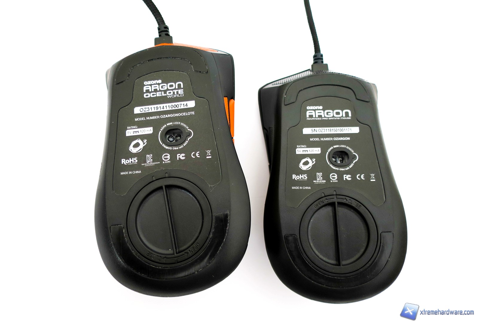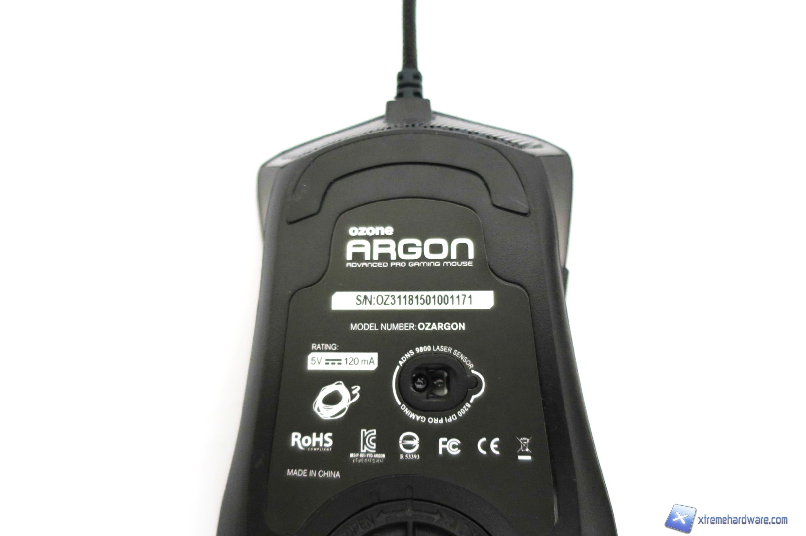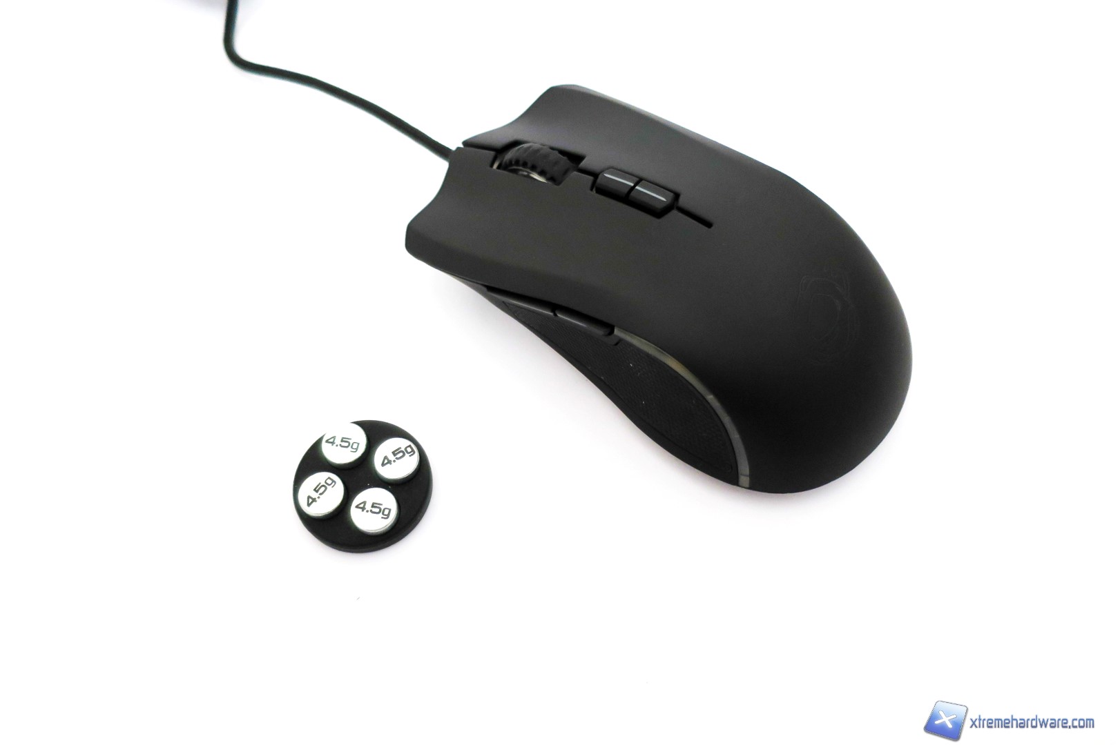 Capovolgendo il mouse, passiamo a dare uno sguardo a cosa si cela sotto. Come sempre al centro, ma in posizione spostata rispetto al baricentro del mouse, è presente il sensore laser AVAGO ADNS-9800 contornato da un adesivo con varie informazioni. Nella parte superiore ed inferiore troviamo i due mousefeet mentre poco sotto il sensore troviamo il vano che ci permetterà di customizzare il peso totale del mouse. Aperto il vano con un piccolo gesto, potremo inserirvi i pesetti inclusi nella confezione o lasciare tutto invariato. Nel bundle, come per il modello Ocelote, troviamo un set di pesetti in alluminio. Nel dettaglio sono forniti 4 pesetti da 4,5 grammi ciascuno per un totale di 18 grammi da sommare tutti o in parte al peso già di per se buono del mouse.