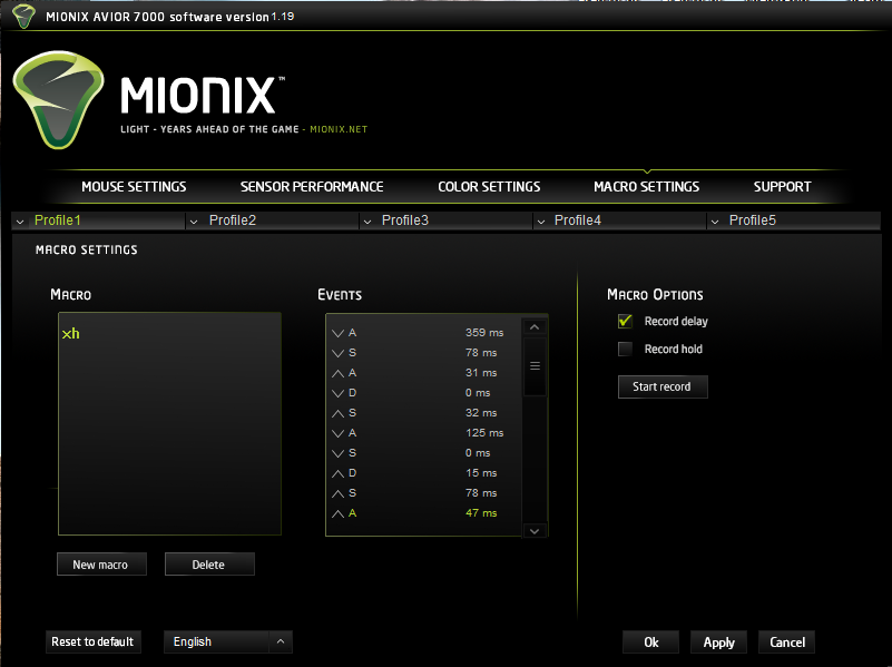 Macro settings è un semplice tool che ci permette di creare le macro. Assegnato il nome alla macro, potremo inserire la successione di comandi dopo aver premuto il tasto start record, scegliendo se salvare o meno i delay reali.