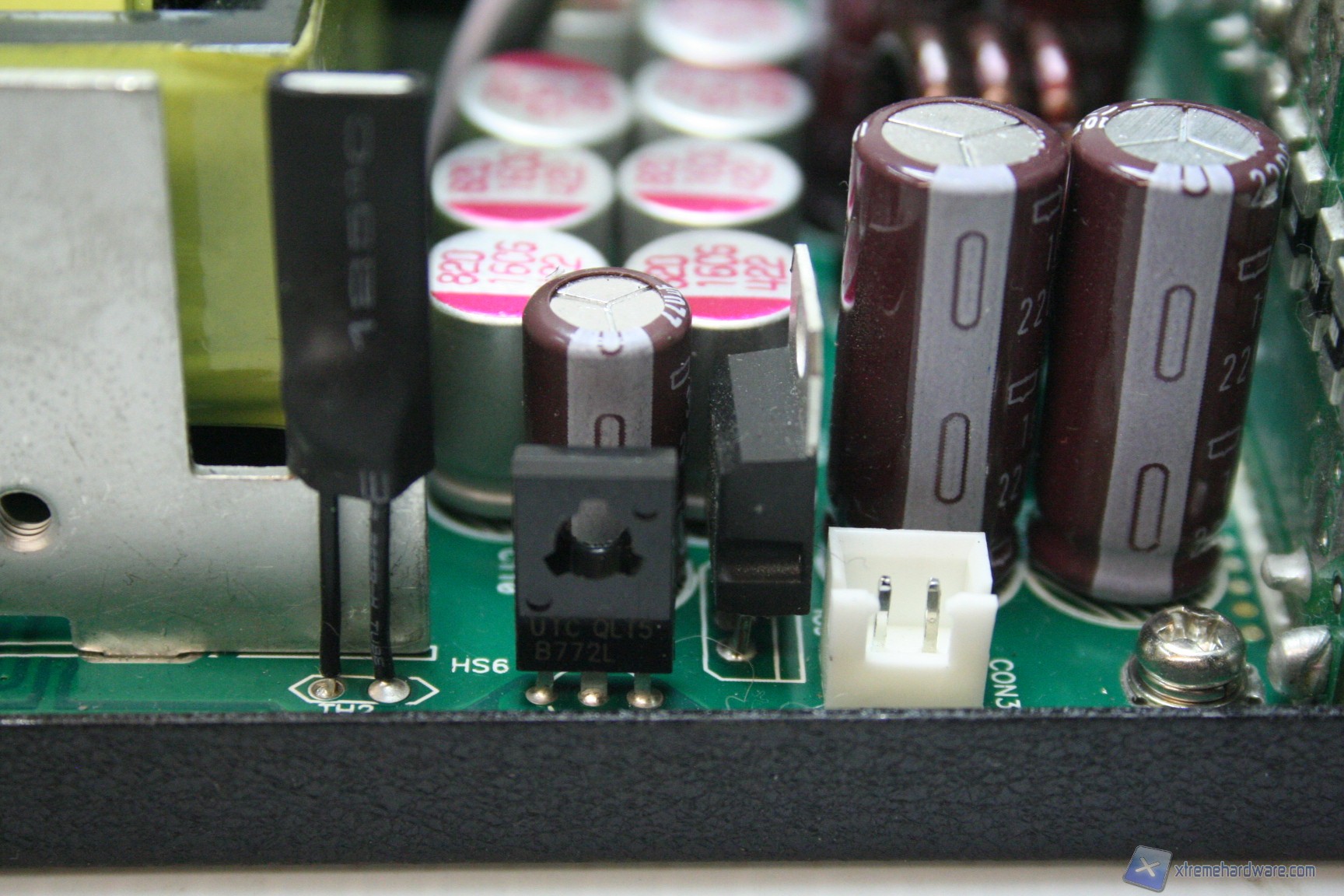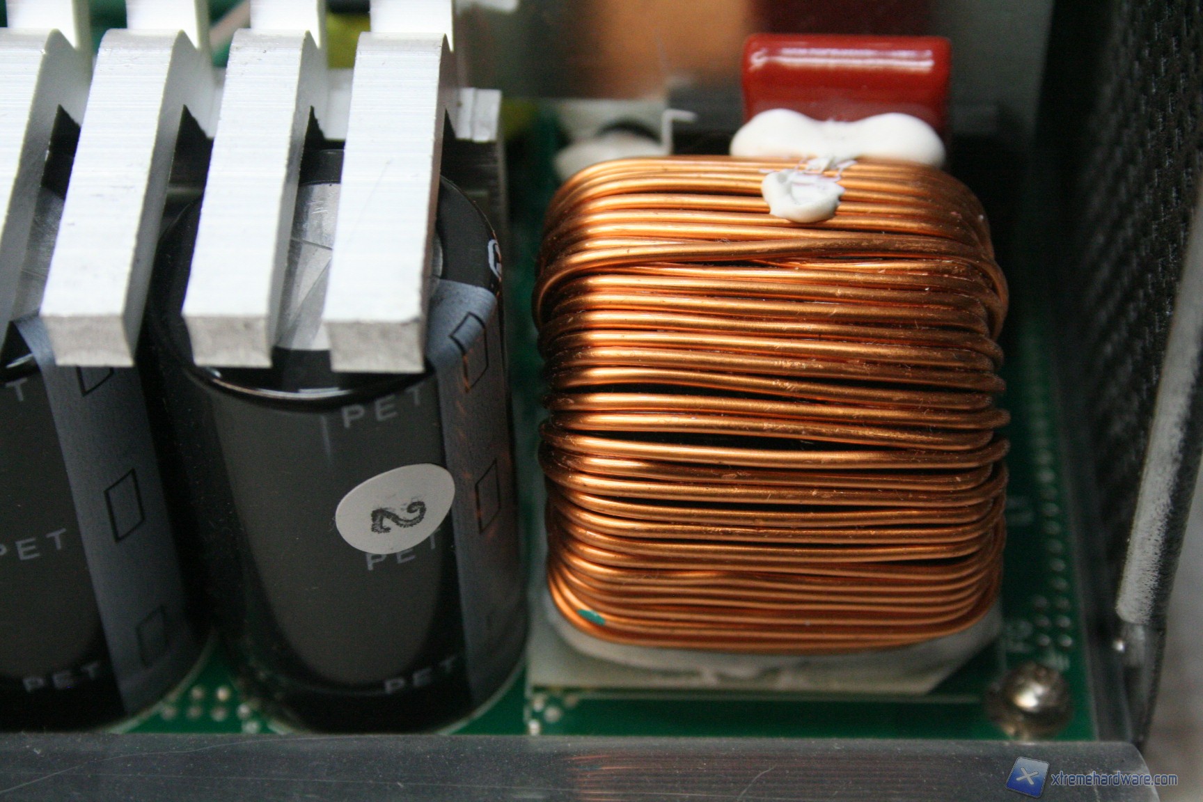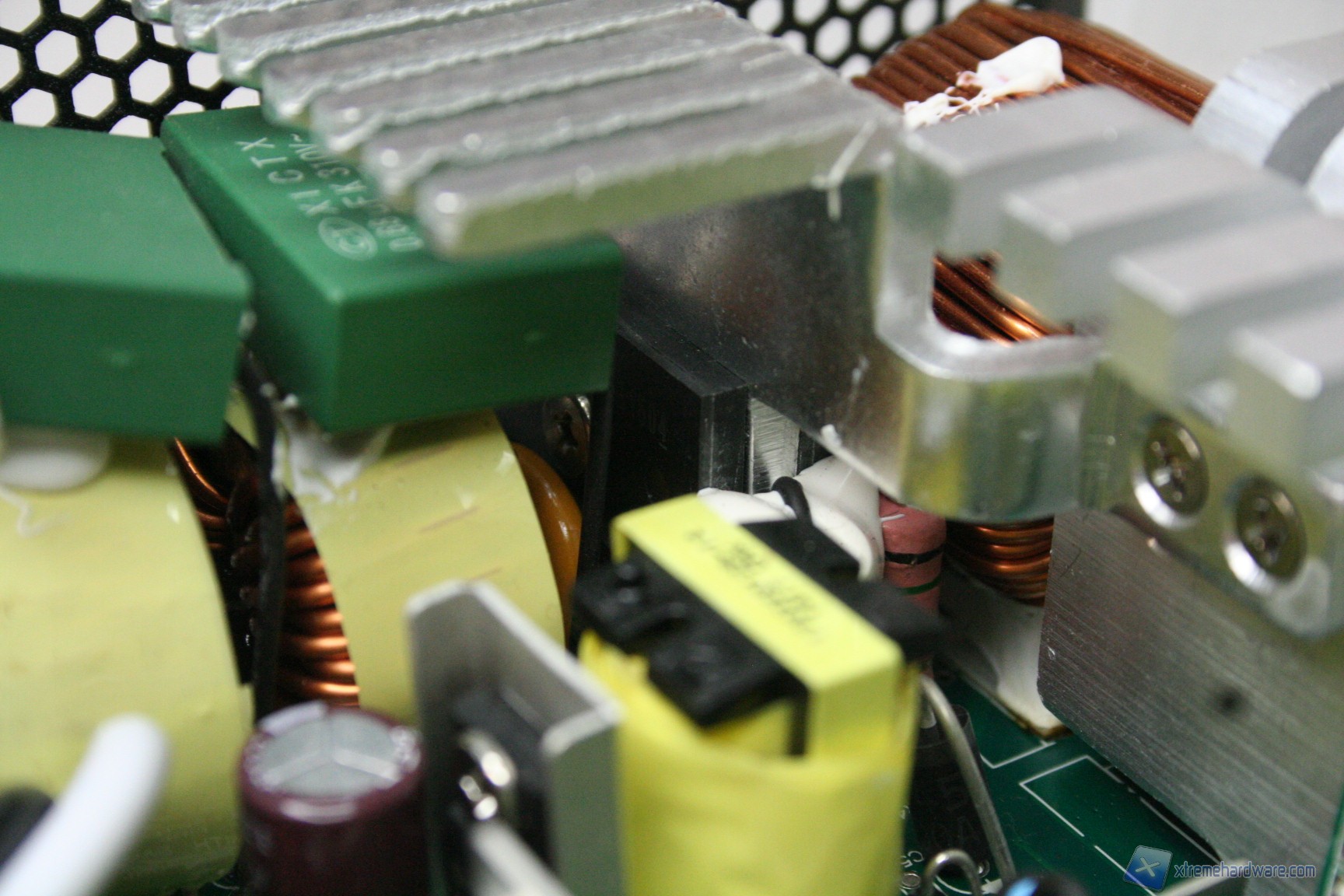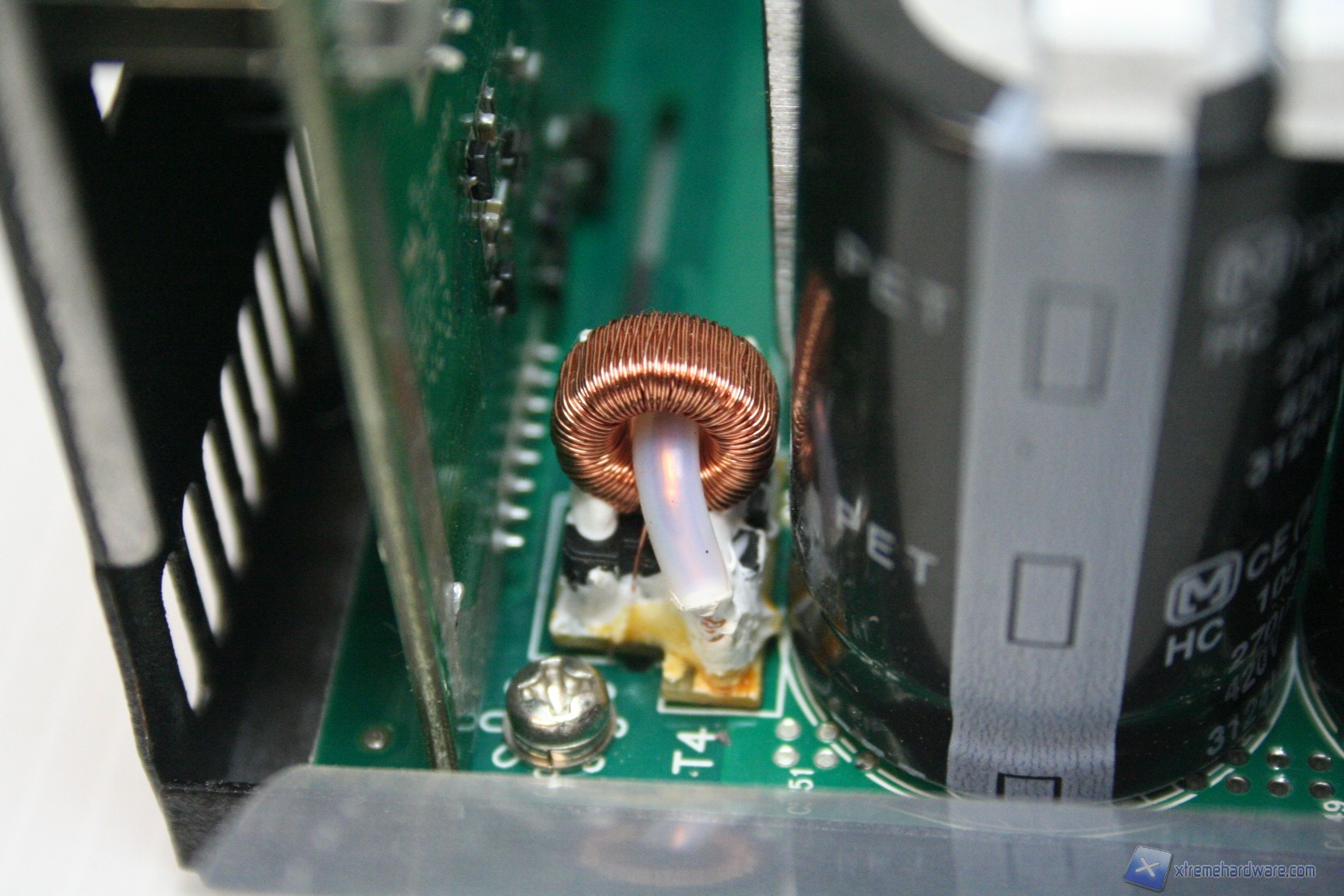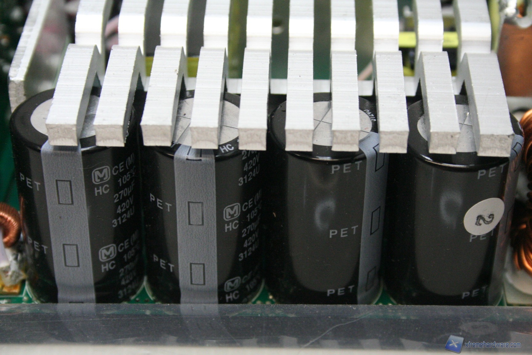 NOTA GENERICA: i condensatori del circuito primario agiscono come buffer e sono molto importanti perché la loro presenza aiuta a proteggere il nostro alimentatore ed il computer stesso da pericolosi sbalzi di tensione e generalmente vengono collegati in parallelo al fine di sommare le singole capacità o, alternativamente, per modelli meno potenti. La tipologia dei condensatori utilizzata è quindi molto importante perché la vita di queste componenti si dimezza in base all’aumento della temperatura di ogni 10 gradi Celsius, sotto un normale carico di lavoro; questo significa che utilizzando modelli di condensatori capaci di gestire, senza il minimo problema anche 105 gradi Celsius, la durata della loro vita potrebbe essere addirittura pari al doppio rispetto a modelli standard da 85 gradi Celsius! Questo fattore è uno dei più sponsorizzati nel campo degli SMPS, non a caso ci si vanta della presenza di condensatori giapponesi nella propria unità, capaci appunto di sopportare temperature maggiori e quindi prolungare la vita stessa dell’unità.
