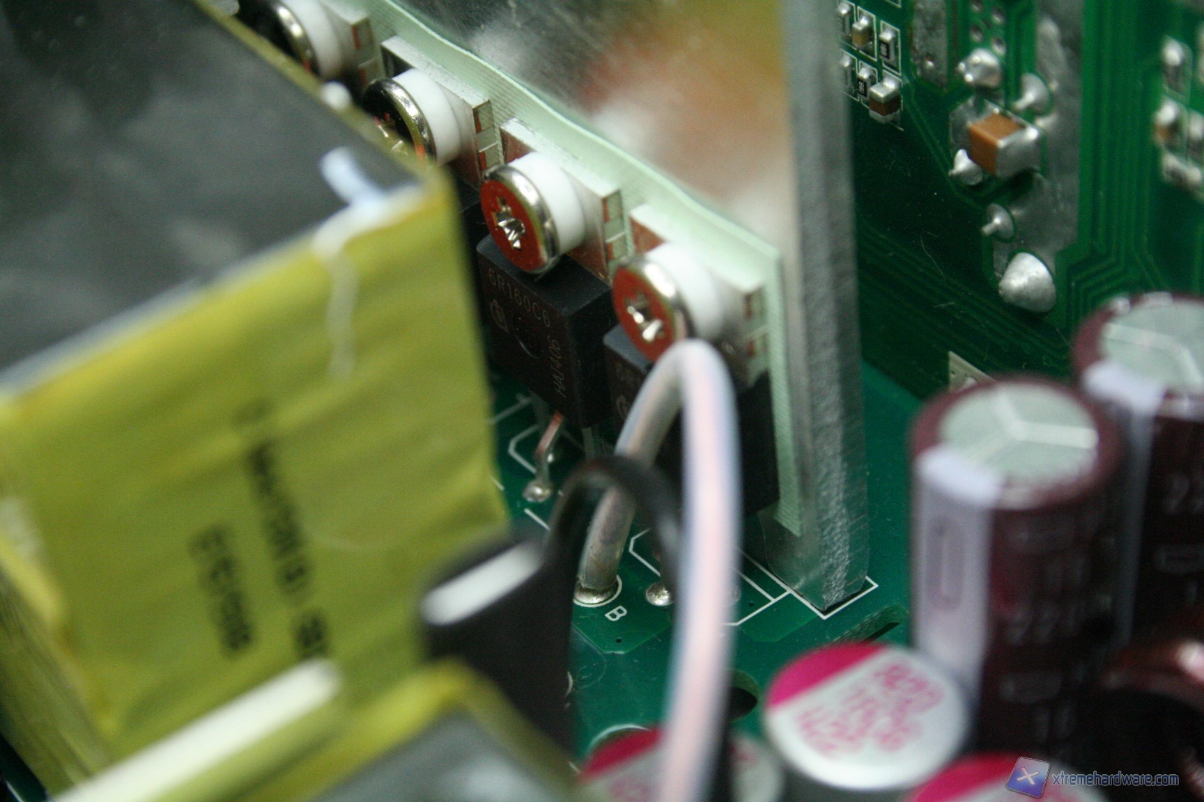 Dietro ad essi troviamo i diodi della sezione PFC, ma purtroppo data l'impossibilità di dissaldare l'unità, non è possibile descriverli. Nell'ultima fotografia troviamo due controller: a sinistra il Power MOSFET CM03X (che fornisce un ottimo R DS(ON) ), ed a sinistra un Single PFC Controller W/Inrush Current Control &Separated PFCOVP - denominato più brevemente Champion CM6500, ed appartenente alla serie TNX