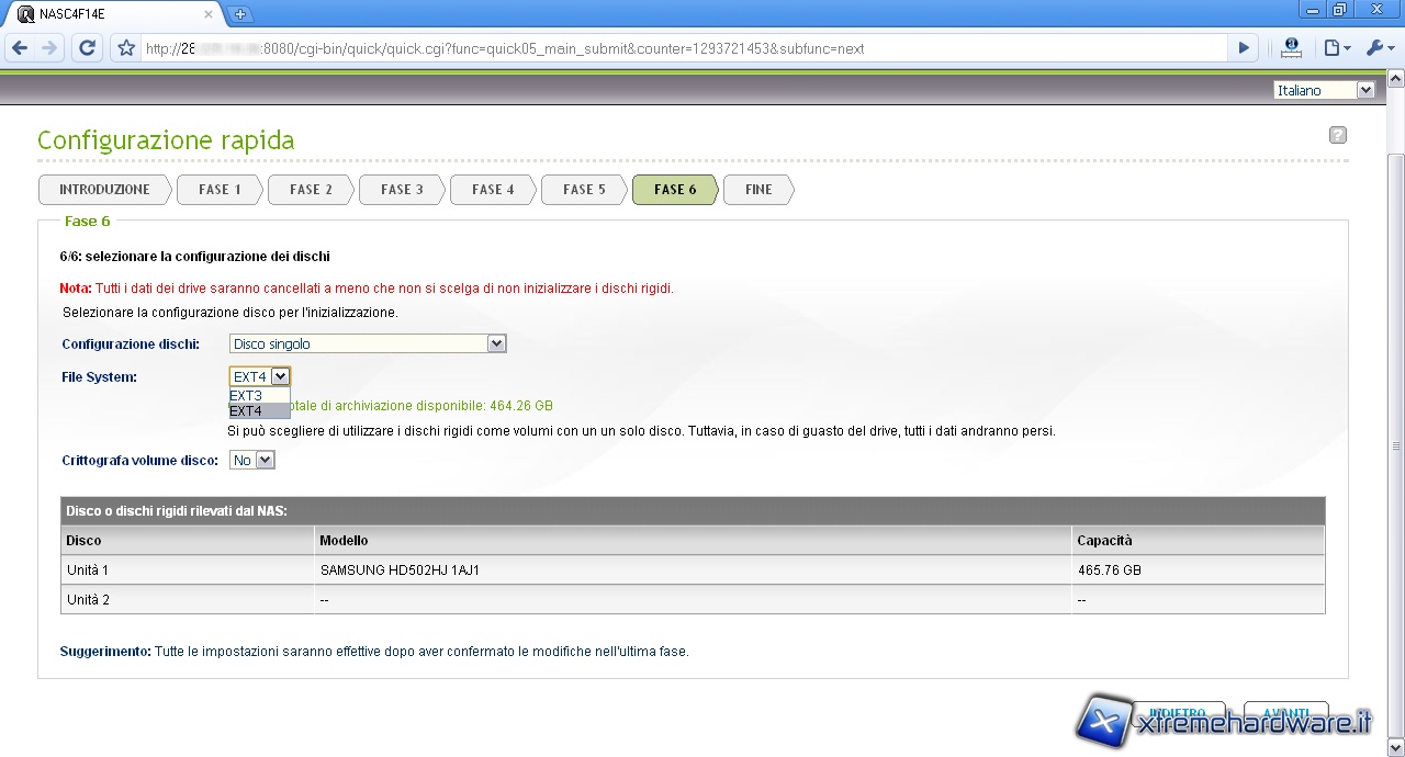 Scegliamo il file system con il quale formattare l’hard disk, le opzioni sono EXT3 e EXT4, due file system utilizzati maggiormente nei sistemi Linux e server, scegliamo EXT4 e proseguiamo.